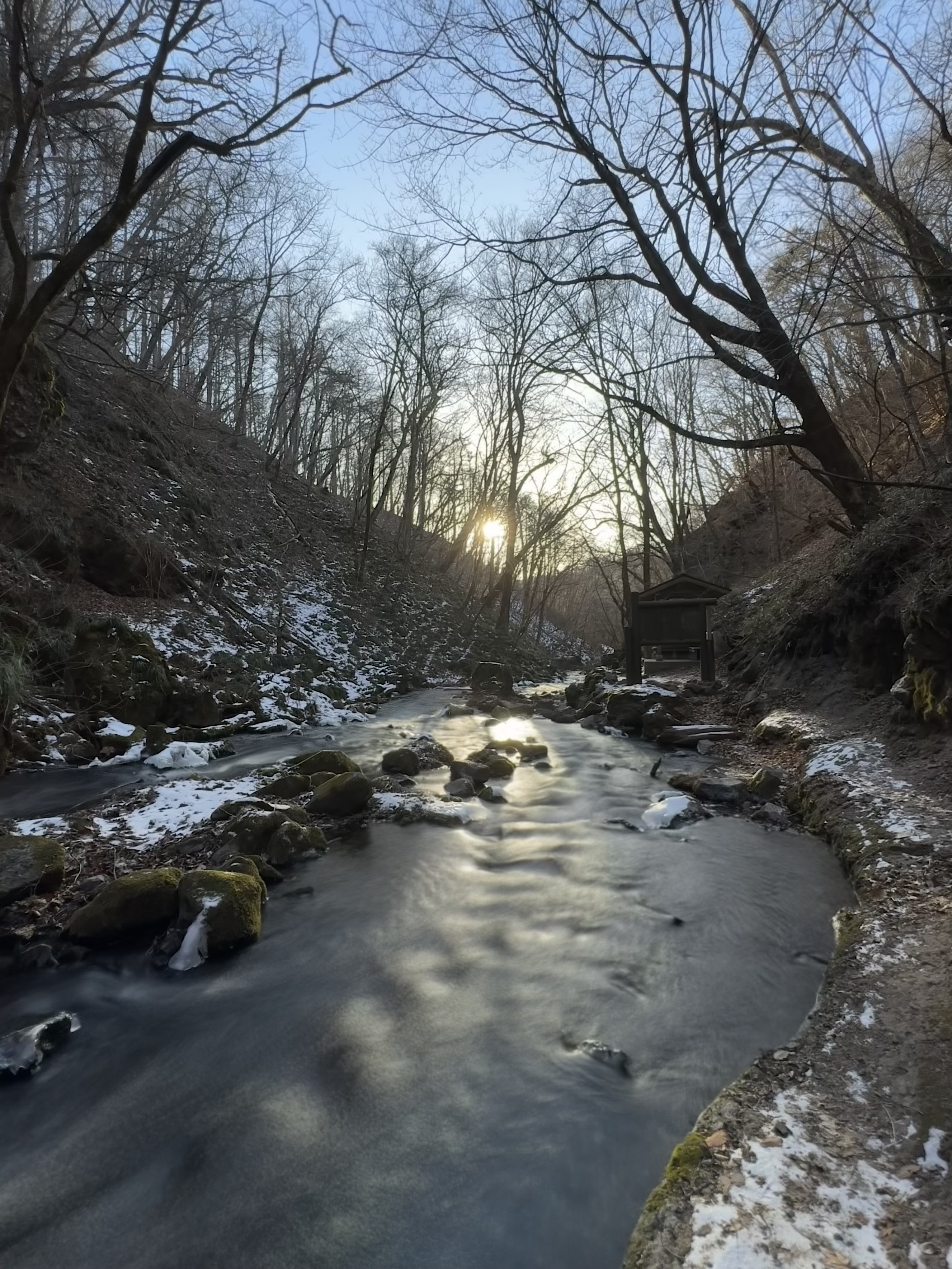 We went to the nearby waterfall, Ryugaeshi no Taki. The place was only a few minutes’ walk along the hiking route, but there was nobody else there except us. Probably because it was very cold and the last bus had already departed. After an arduous journey, trying not to slip on the trail made slippery by snow, we arrived there. One word to describe what I saw: beautiful. I put a photo below: