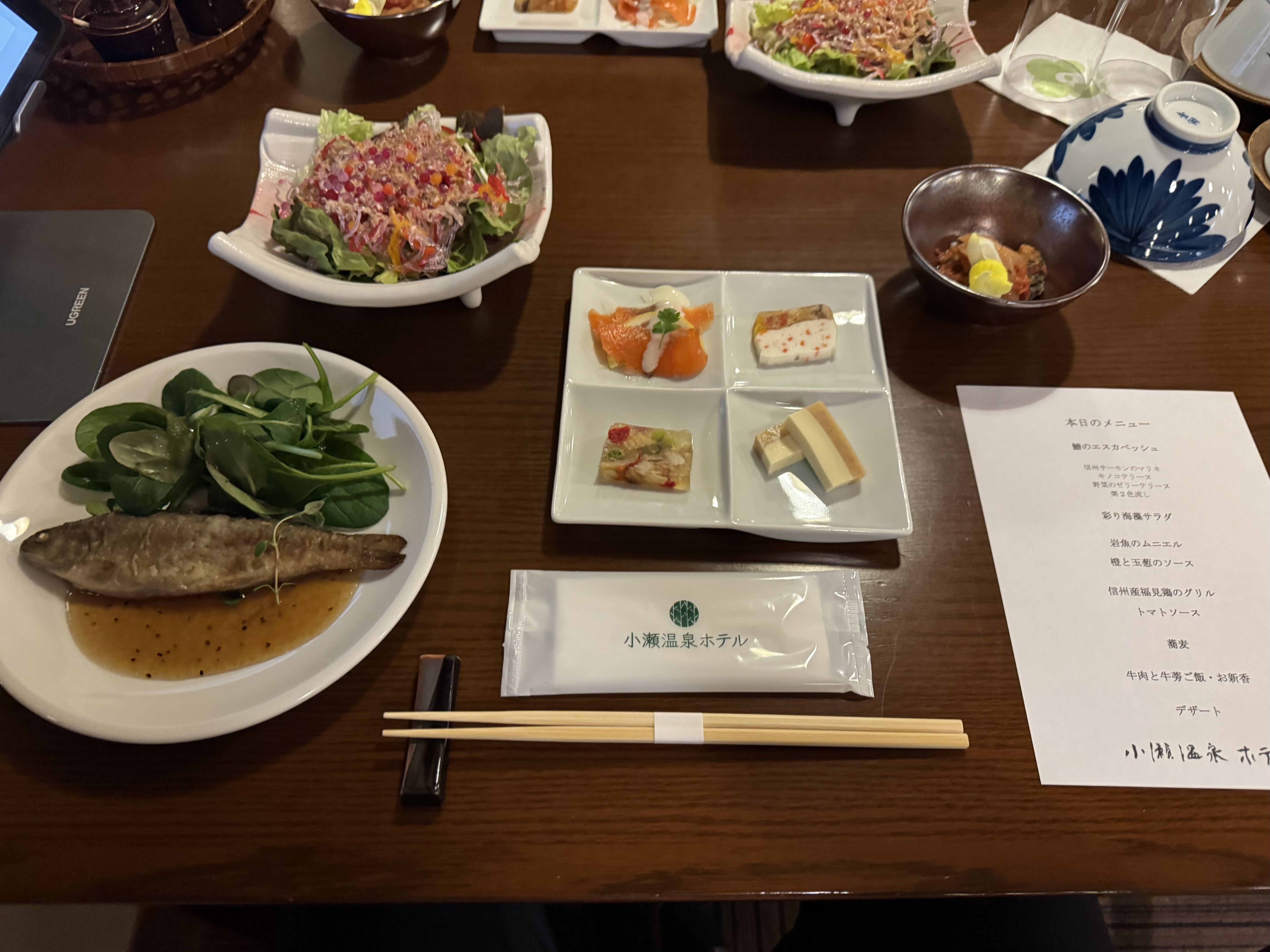 After this, we went back to the ryokan and were served dinner. They say that the main attractions of the ryokan are its dinner and its onsen (natural hot spring bath). The dinner was really good; I particularly liked the fish, iwana (Japanese charr).