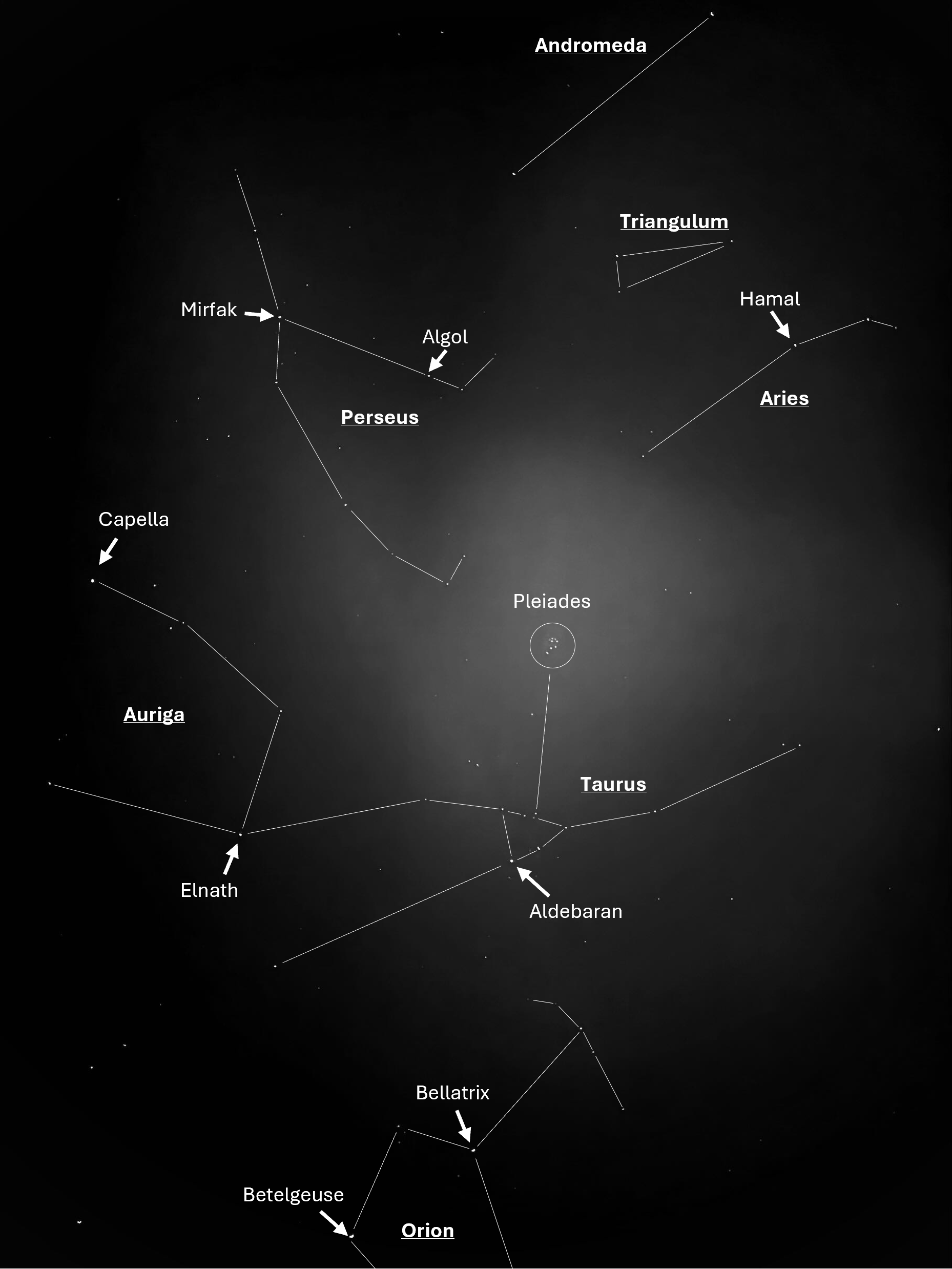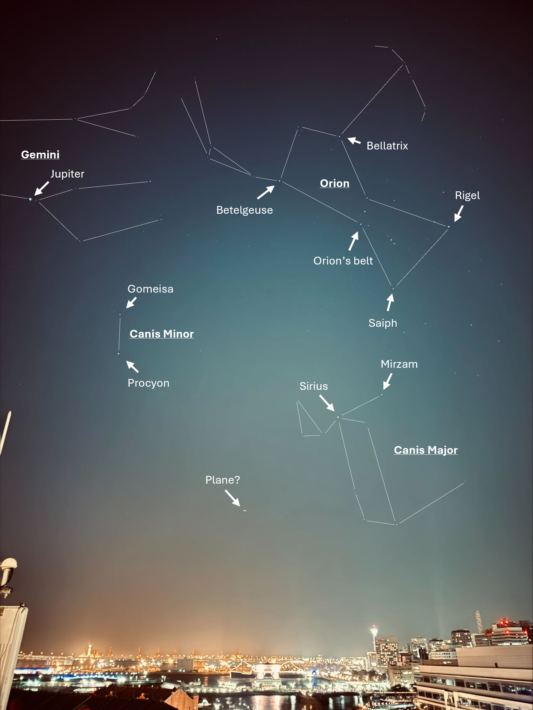 We saw Orion’s Belt, Sirius, Procyon, and Jupiter quite clearly. My wife took a picture of the sky with her iPhone, and to my surprise, it could capture the stars on camera! It could even capture stars near the Orion Nebula and the Pleiades, although they cannot be seen with the naked eye. (I put some of the star names in the pictures we took below.)